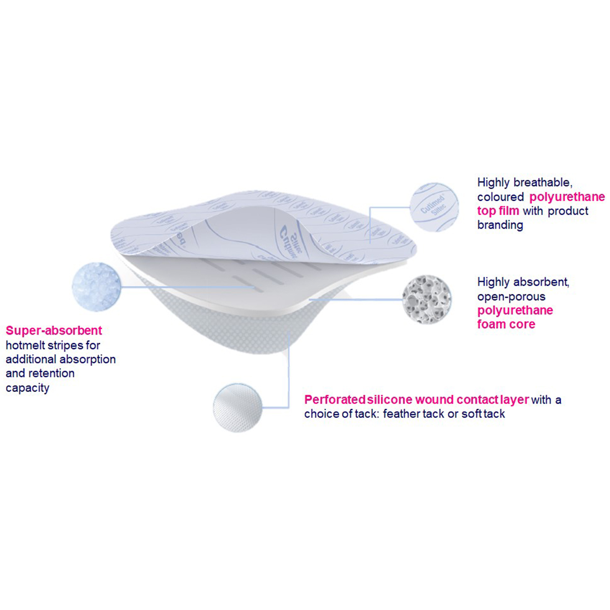 - Efficient Exudate Control – Features vertical absorption and also superabsorbent stripes for optimal fluid management.